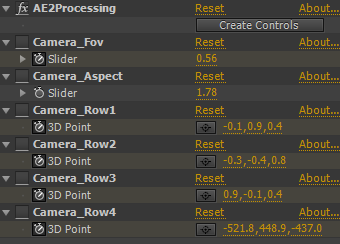 カメラ情報をProcessing側に持っていくために、カメラ行列等の情報をエクスプレッション制御エフェクトにベイクするプラグイン。